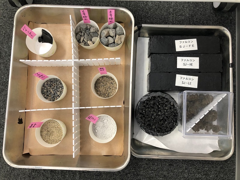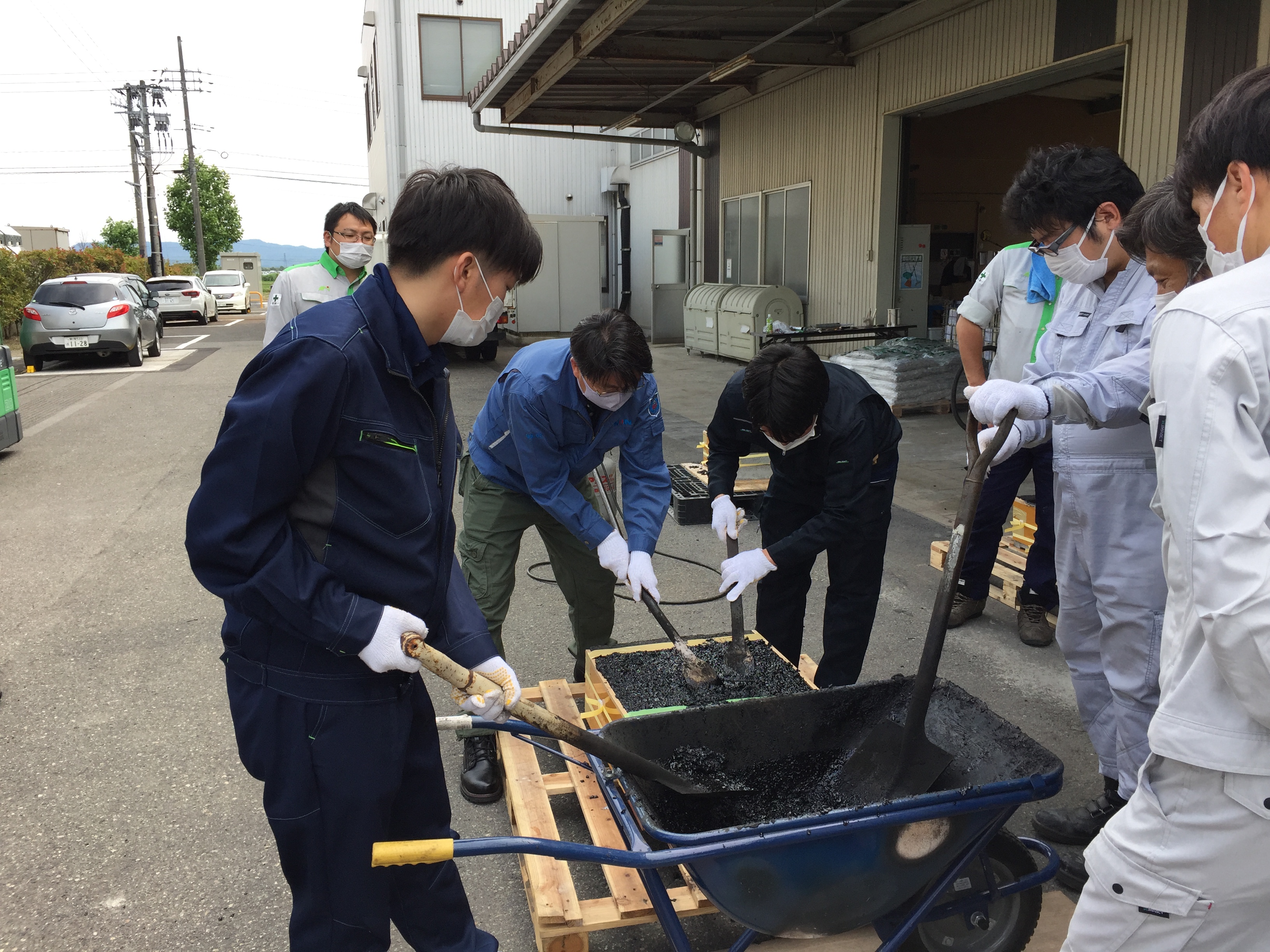 初日の座学では、日本の橋梁維持の現状、埋設型伸縮装置「シームレスジョイント工法」の特徴や施工手順、 弾性加熱合材ファルコンの種類や骨材、舗装の構造等、止水性のある目地材「メジエイド」「EGS」、施工機械(FCクッカー、FCチッパー、バーナーコテ、等)について学習しました。